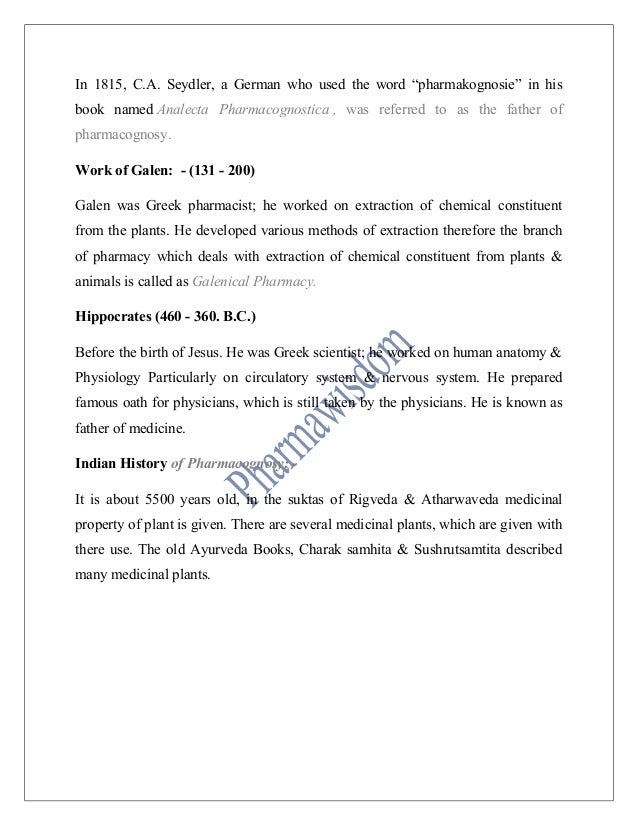 The nomenclature ‘Pharmacognosy’ was used first and foremost by C.A. Seydler,